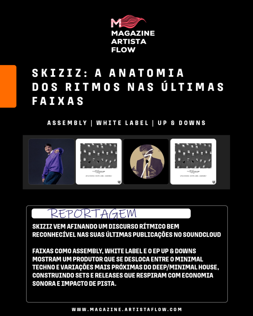 Skiziz mostra maturidade na economia sonora: seus lançamentos recentes são estudos de textura e groove, pensados tanto para DJs quanto para quem curte escutar com fones. Assembly, White Label e Up & Downs desenham um artista confortável no espectro entre minimal techno e minimal/deep house, que usa pequenas variações rítmicas para construir jornadas sonoras hipnóticas e funcionalmente perfeitas para a pista. Para ouvir e confirmar essas características, recomendo checar diretamente as tracks no SoundCloud e o perfil do artista. SoundCloud+3SoundCloud+3SoundCloud+3